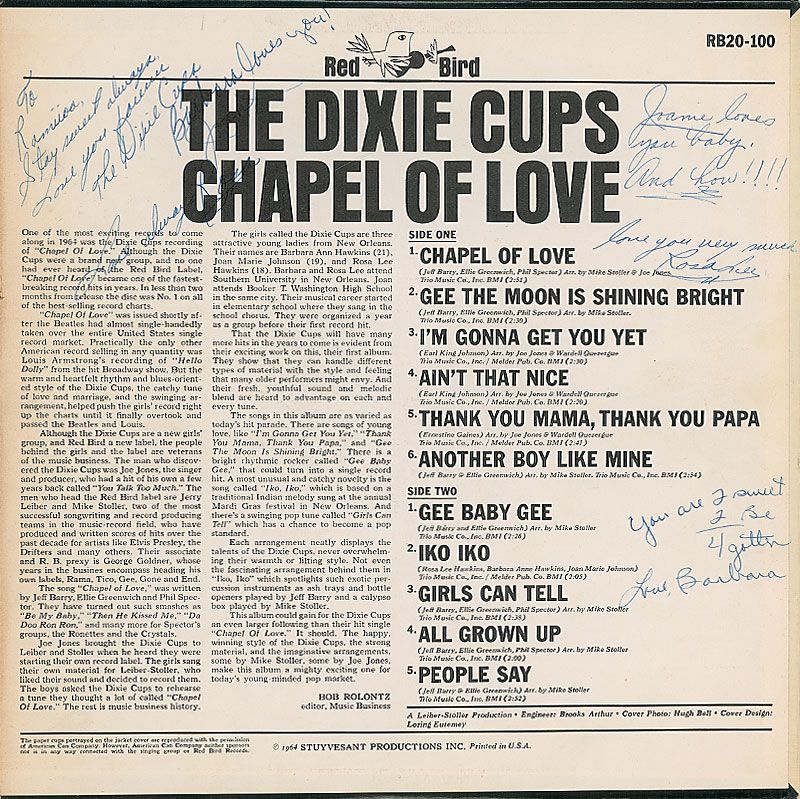 Chapel of Love album signed and inscribed on the back cover in blue ballpoint by Rosa Lee Hawkins (2), Barbara Anne Hawkins (2), and Joan Marie Johnson, all signing first name only. In fine condition. The record is included.