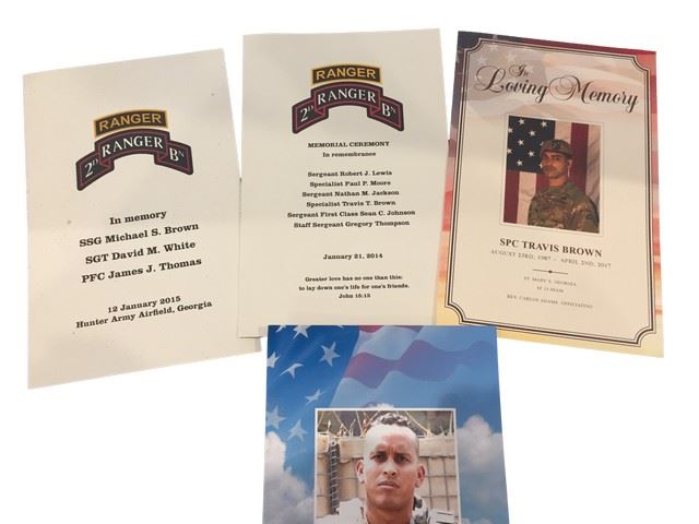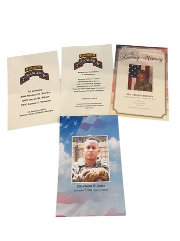 Screen used, fallen soldier's funeral program for the following soldiers, Dustin Jones, Travis Brown, Robert Lewis, Paul Moore, Nathan Jackson, Sean Johnson, Gregory Thompson, Michael Brown, David White, and James Thomas. 4 programs in all. (10x6).