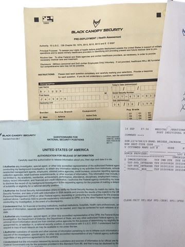 Jackson Briggs (Channing Tatum) Screen used, pre deployment paper work from doctors and dentist, health release forms, imunization form, copies of drivers license, passport, and health assessment. (11x9).