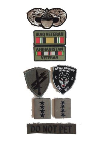 Jackson Briggs (Channing Tatum) Screen used, patches, 8 in all, includes, 2 Iraq and Afghanistan Veteran patches, 2 four star patches, 1 k 9 unit, 1 Do Not Pet, and 2 others. (7x4)