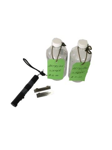 Jackson Briggs (Channing Tatum) screen used, two glass water bottles labeled "Atesian Water $10.00, a red laser light and 2 name badges labeled "D. Shaughnessy". (8x6)