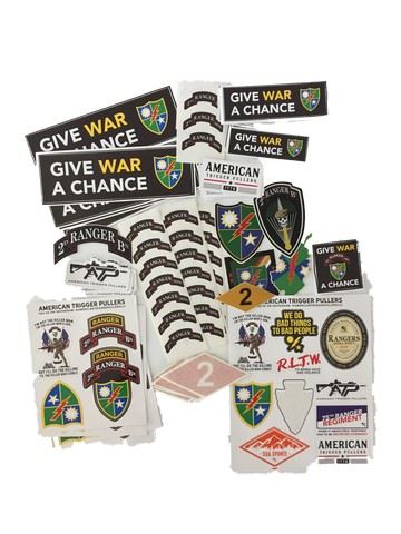 Screen used, large collection of bumper stickers and regular stickers, stickers includes are from "Rangers", "American Trigger Pullers", and "Give War A Chance", ~50 stickers in all. (10x12).