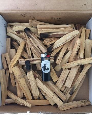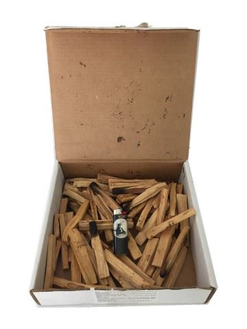 Screen used, box of "Palo Santo" sticks, used for stress relief and incense, includes black "Bick" lighter with dinosaur on a moped. (11x10)