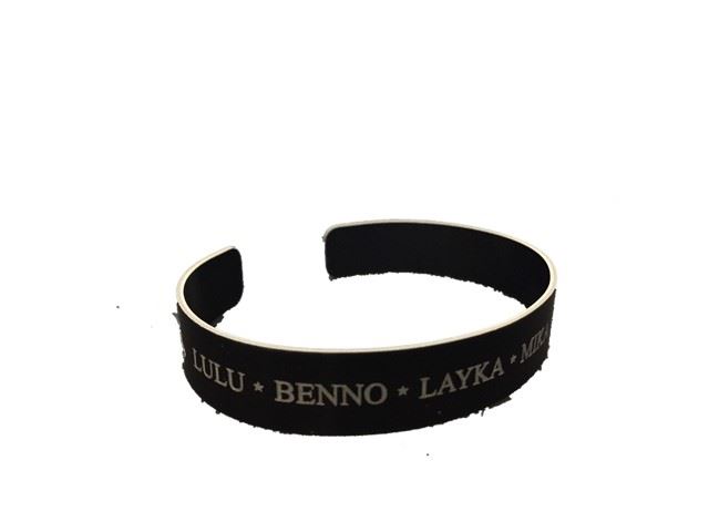 Lulu ( German Shepard) screen worn, black and silver metal dog's bracelet, engraved on the bracelet says "Lulu, Benno, Layka, Mika, Pepper, and Nike, on the inside reads "RLTW". (3x2)