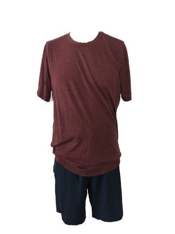 Noah (Ethan Suplee) screen worn, hero, maroon (Goodlife) t-shirt (XL), blue "Val Surf) shorts (38).