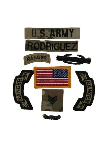 Lot of army patches, pins and a camoflauge hat for Rodriguez (Rene Rivera). Includes an American flag, ranger 2d bin, an army patch, a ranger patch, 2 hat patches with velcro that says: Rodriguez (Rene Rivera) and two military pins.