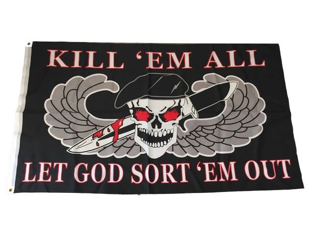 Screen used, red, black, and red nylon flag with a skull design that reads "Kill Them All And Let God Sort Them Out". (61x36)