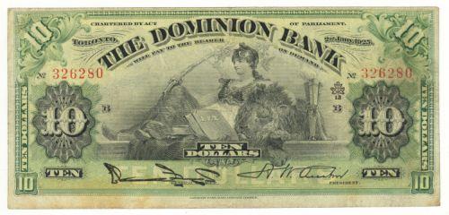 The Dominion Bank, $10.00 1925, F/VF, serial 326280, letter B, Signature Austin at right, Charlton number 220-18-10, few very tiny holes in the folds.