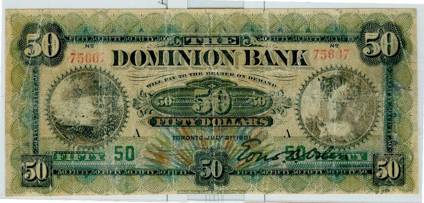 The Dominion Bank, 1901 $50 #75607 CH-220-22-02. The note grades VG to Fine but has been professionally restored. A rare note! Very few examples are known!