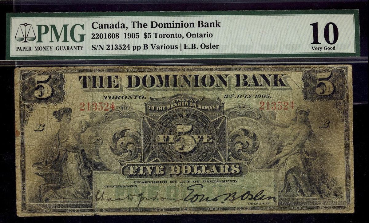 The Dominion Bank, 1905 $5 #213524 CH-220-16-08. PMG VG10.