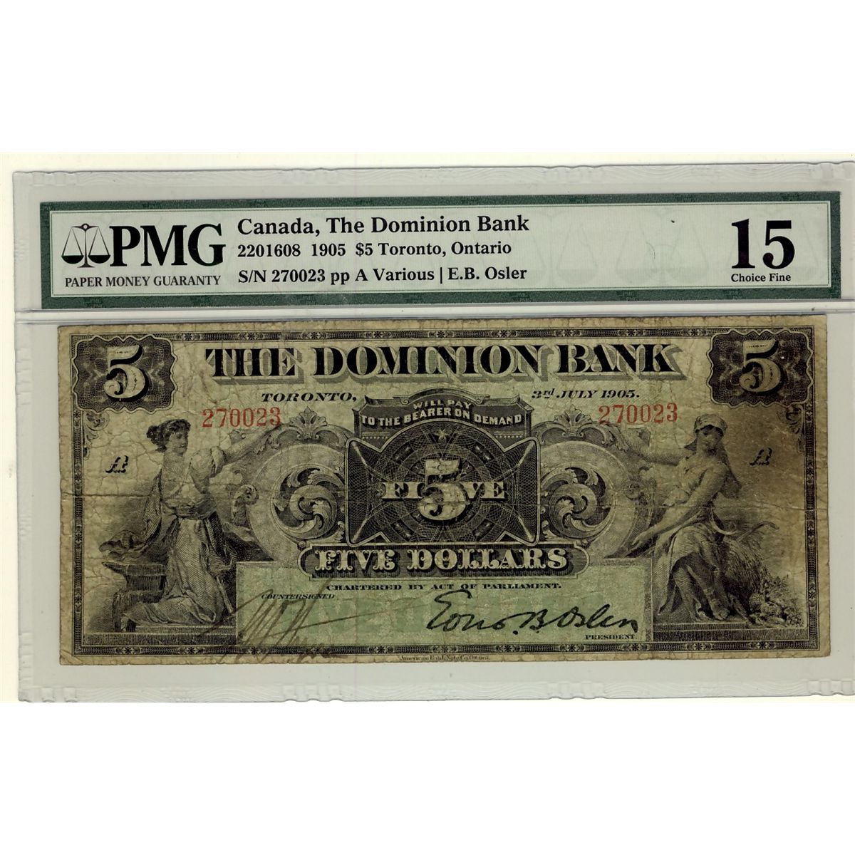 The Dominion Bank 1905 $5 #2700023 CH-220-16-08 PMG F15.