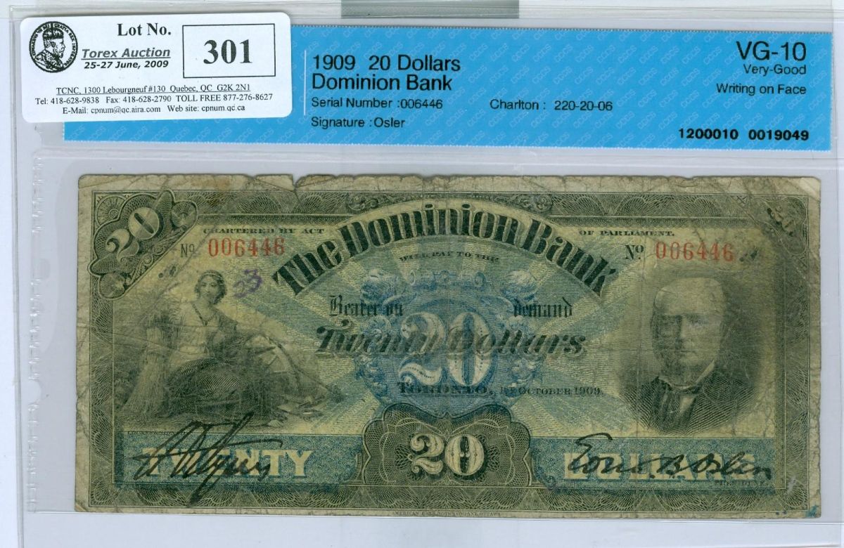 The Dominion Bank, 1909 $20 #006446 CH-220-20-06 CCCS VG10, minor tear at center.