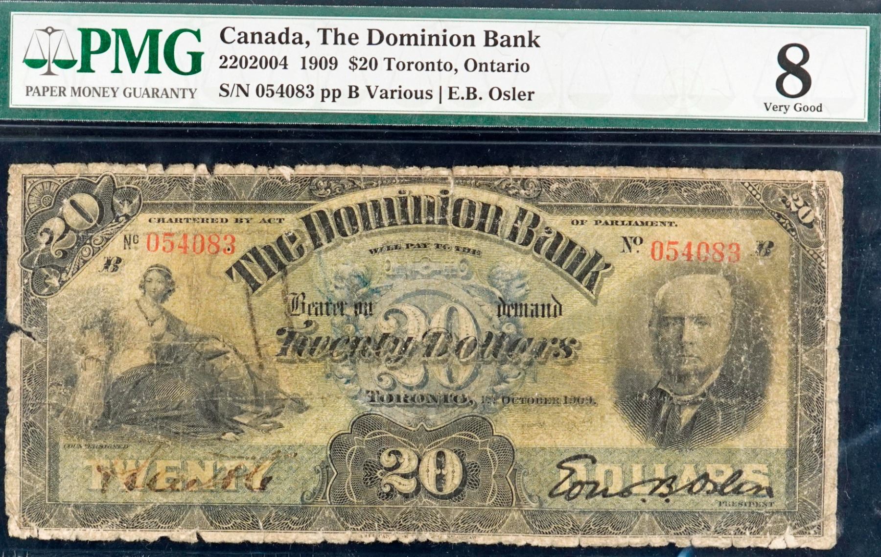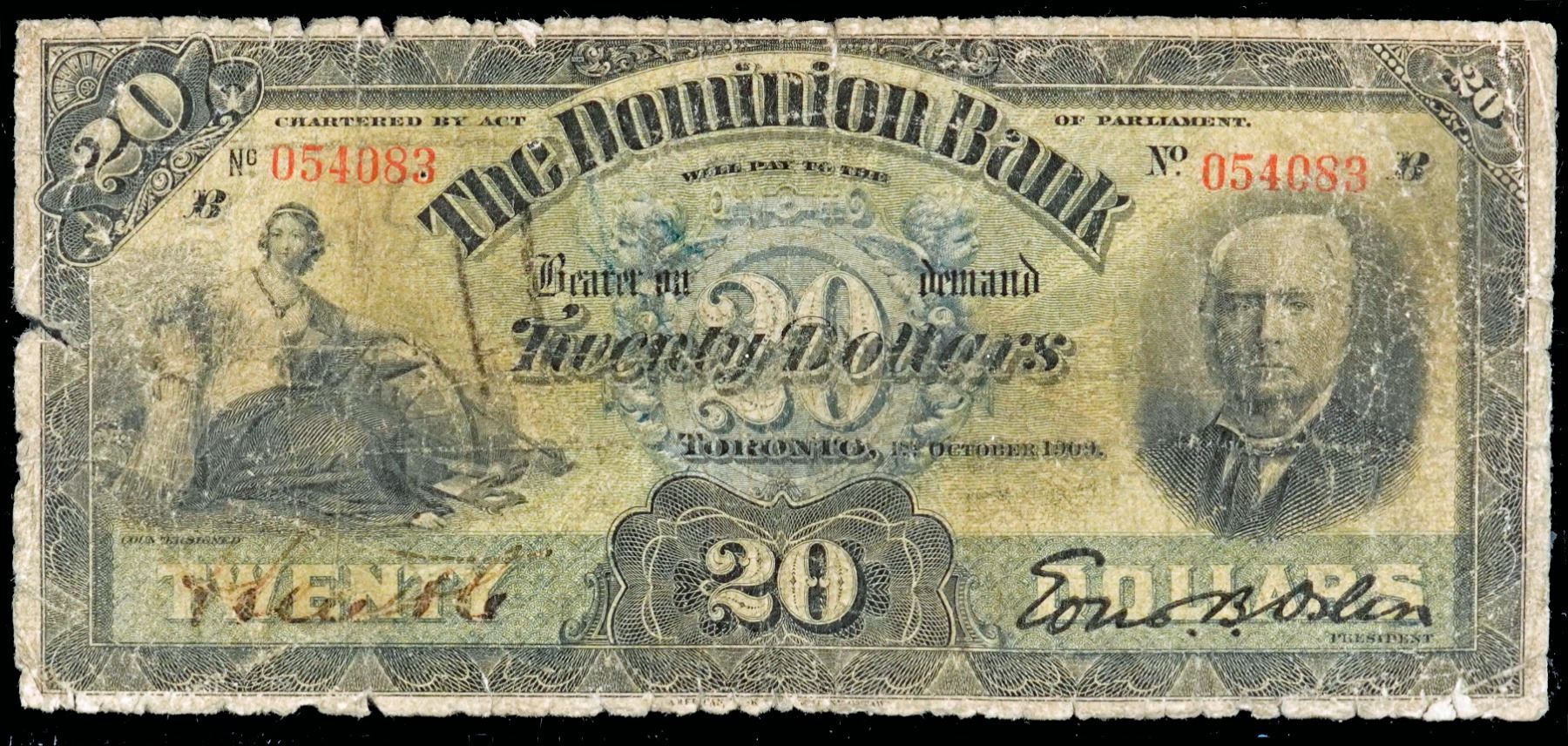 The Dominion Bank; 1909 $20 #054083 CH-220-20-04, PMG Very Good-8 with border issues.
