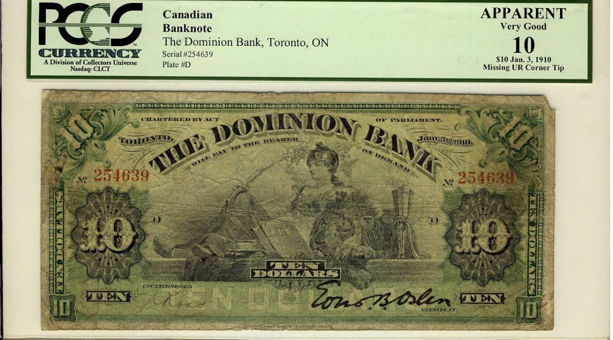 The Dominion Bank, 1910 $10 #254639 CH-220-18-04. PMG Apparent VG10, missing UR corner.