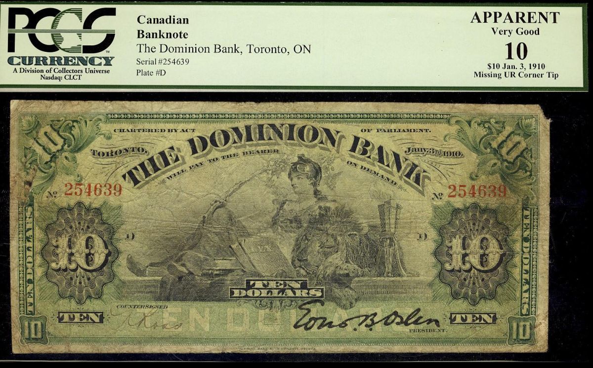 The Dominion Bank, 1910 $10 #254639 CH-220-18-04. PMG Apparent VG10, missing UR corner.