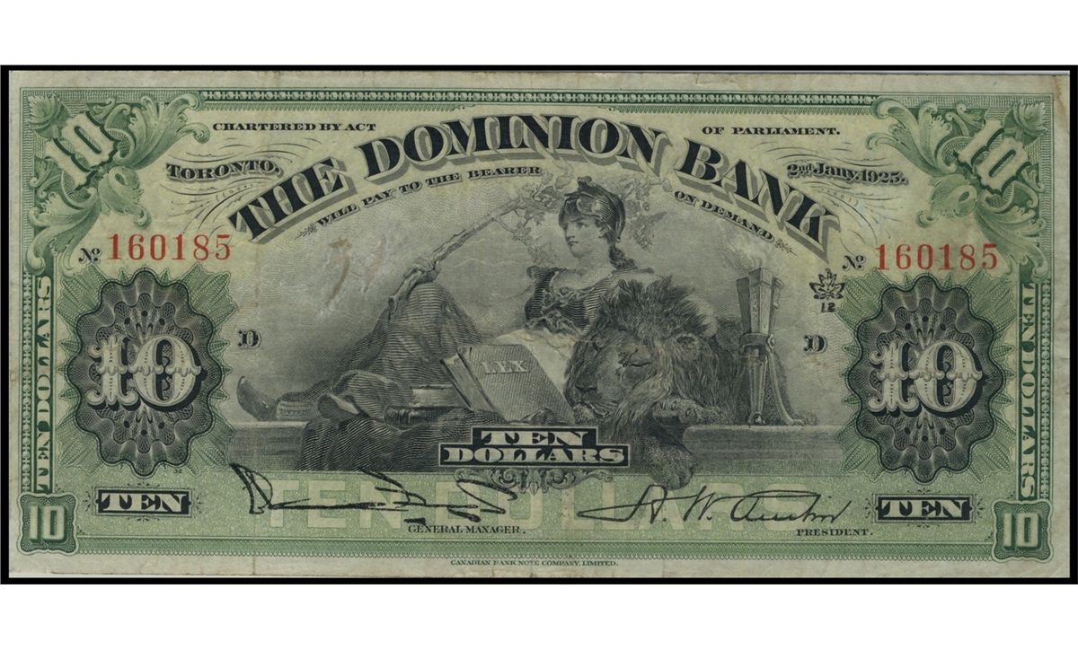 The Dominion Bank; 1925 $10 #160185 CH-220-18-10 PMG VF25.