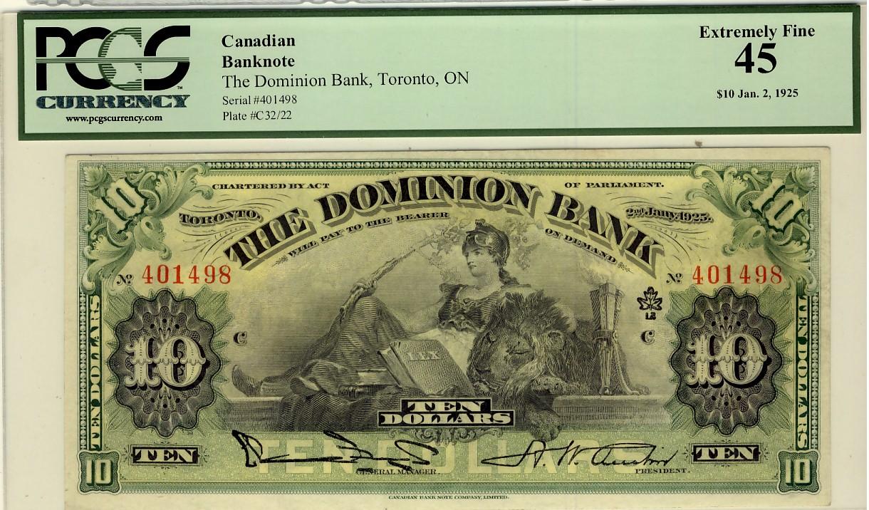 The Dominion Bank 1925 $10 CH-220-18-10 S/N 401498 PCGS EF45. A very flashy example with great colours. Looks choice and much better than the grade assigned. Rare in this exceptional condition.