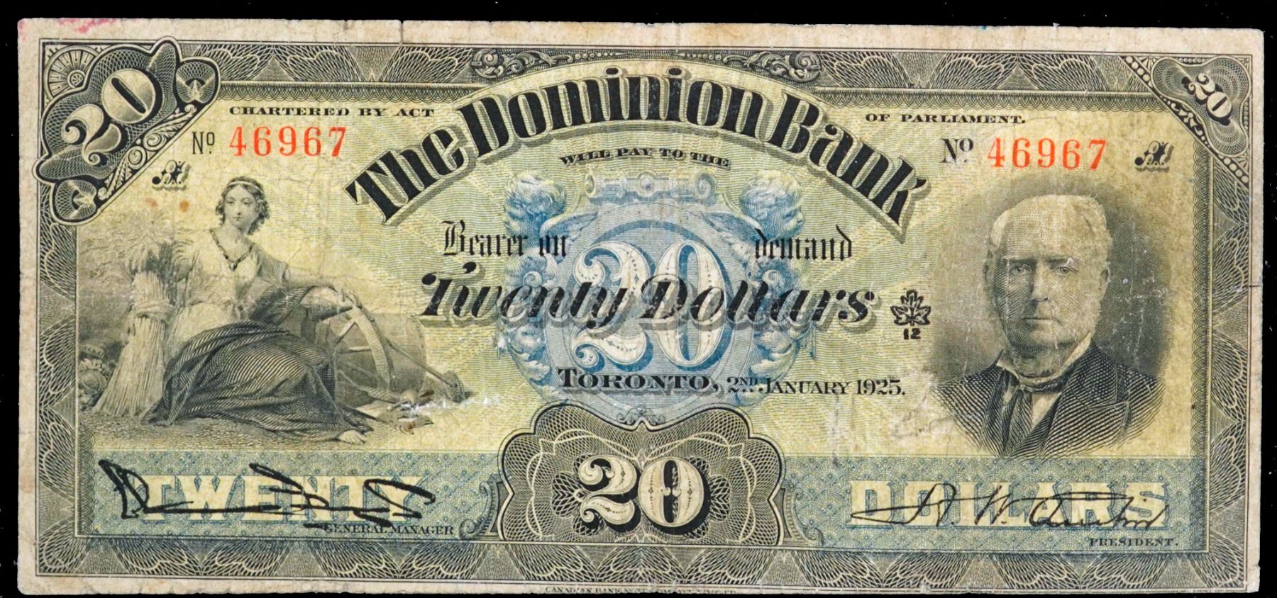 The Dominion Bank 1925 $20 #46967 CH-220-20-08, F-VF.
