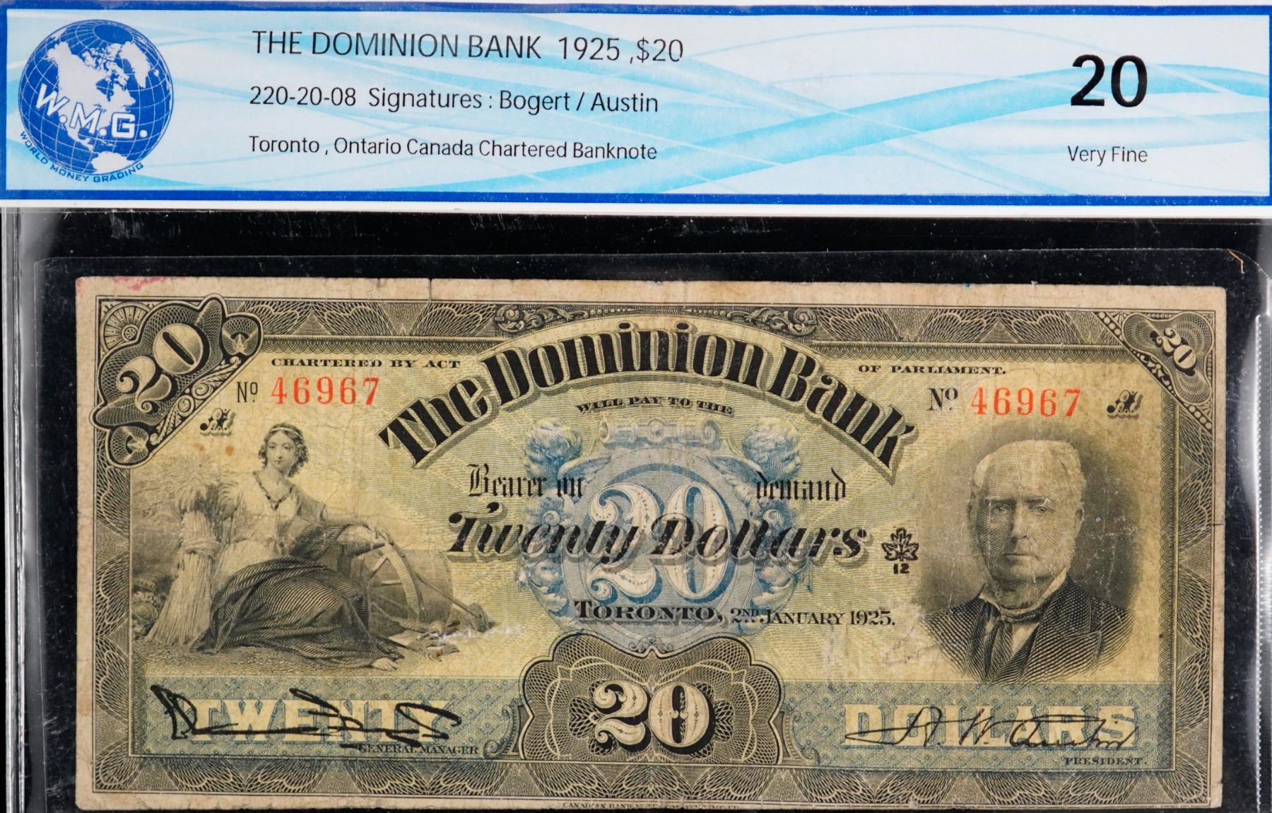 The Dominion Bank 1925 $20 #46967 CH-220-20-08, WMG Very Fine-20. View and Bid accordingly.