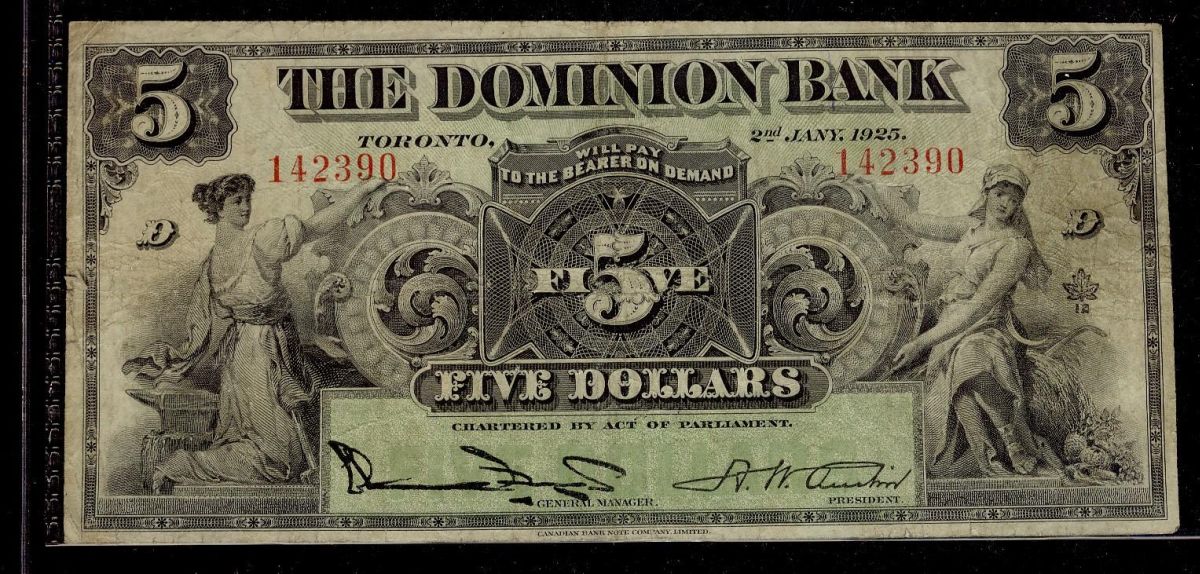 The Dominion Bank, 1925 $5 #142390 CH-220-16-14, F-12, serial 142390.