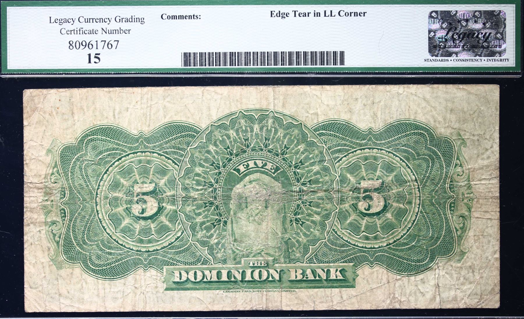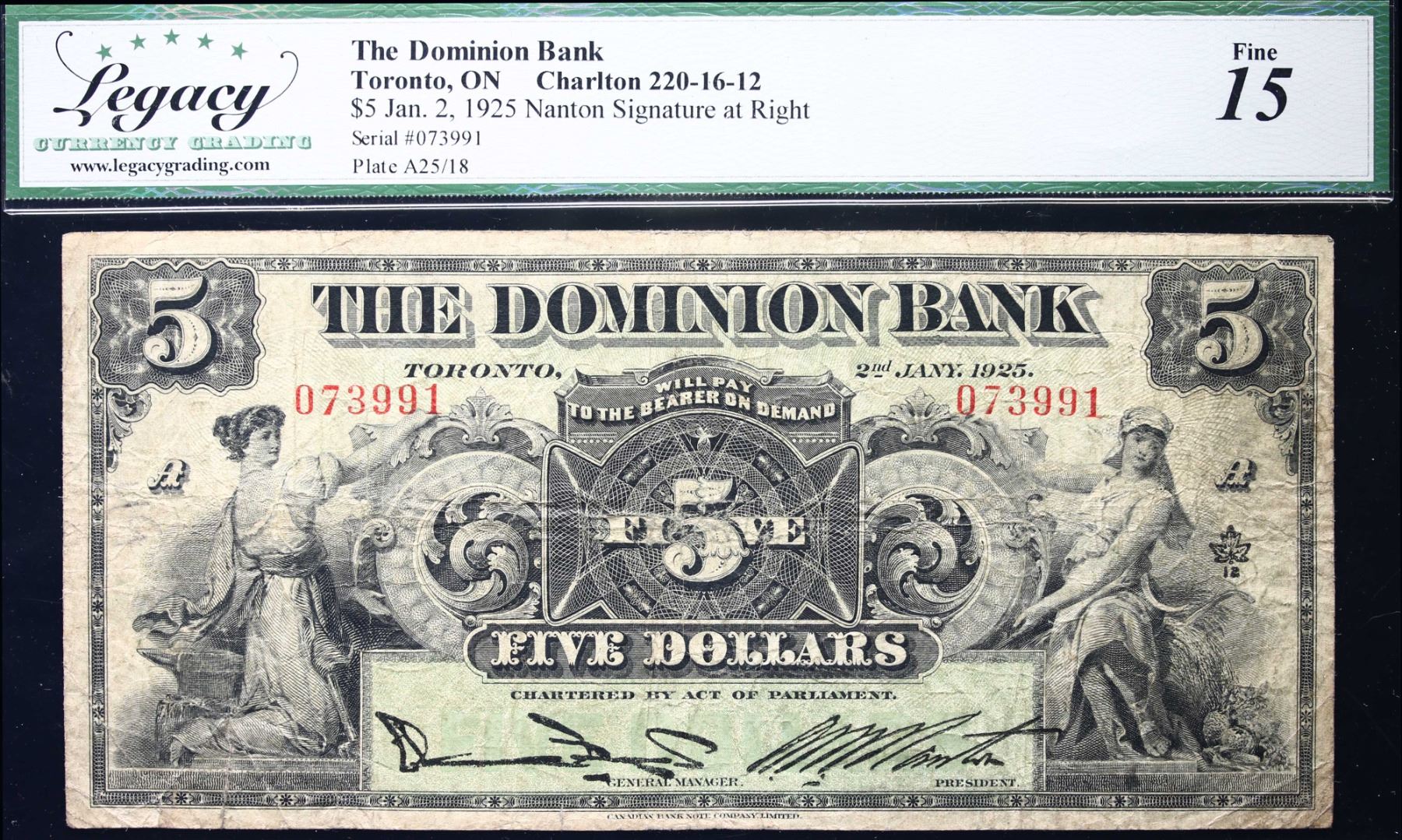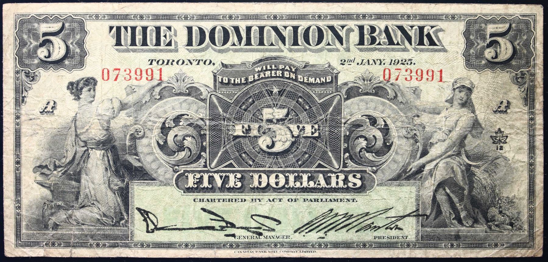 The Dominion Bank 1925 $5 CH-220-16-12 #073991 LCG Choice Fine-15, edge tear. Rare "Nanton" signature.