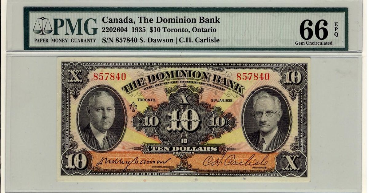 The Dominion Bank 1935 $10 #857840 CH-220-26-04, PMG Gem UNC66 EPQ. A great example. Very flashy. T