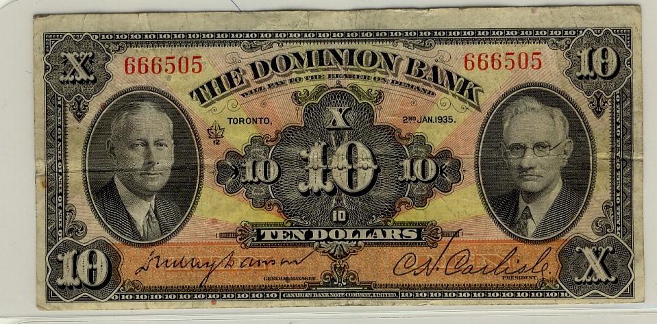 The Dominion Bank, 1935 $10, CH-220-26-04. Nice colours, VF