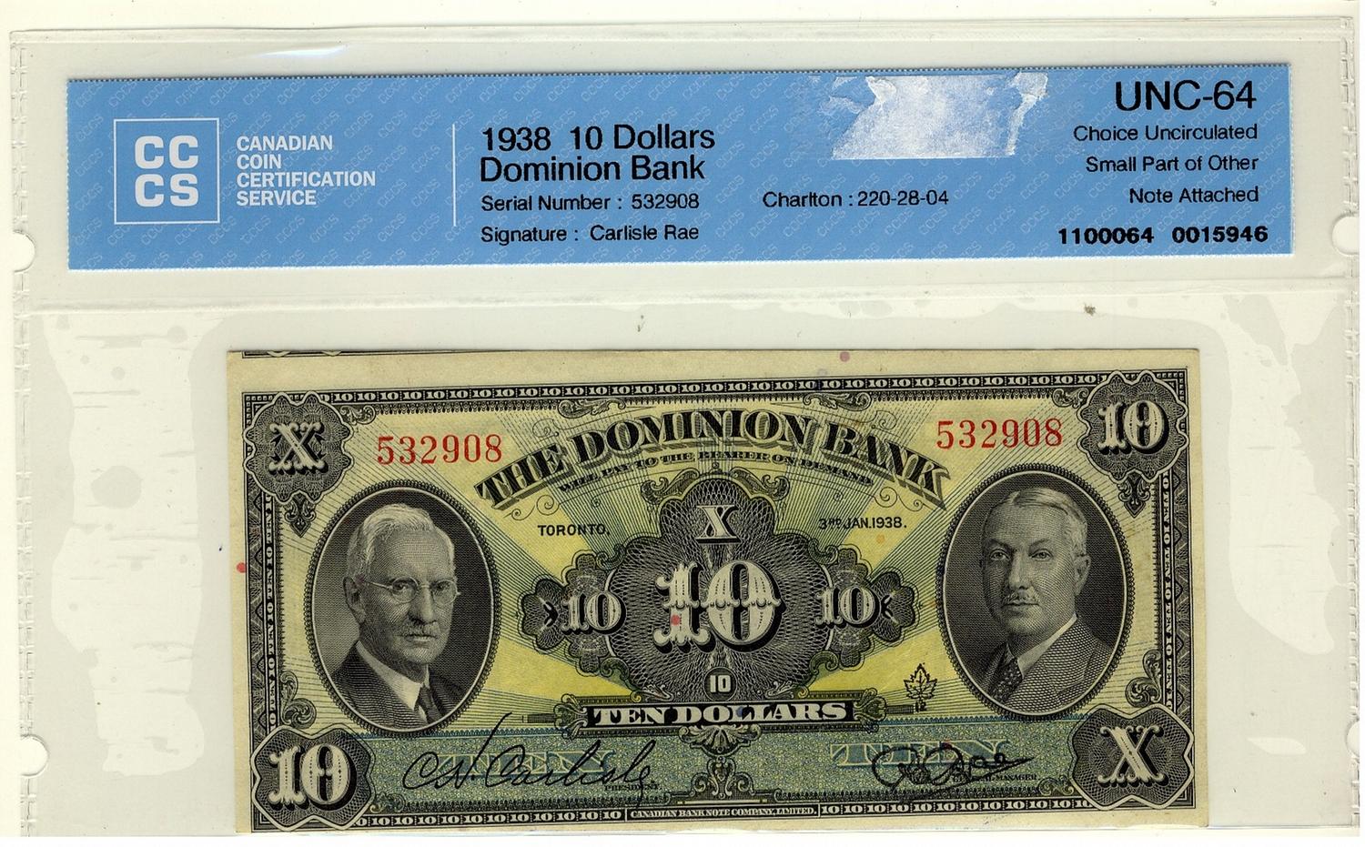 The Dominion Bank, 1938 $10 #532908, CH-220-28-04, CCCS UNC64.