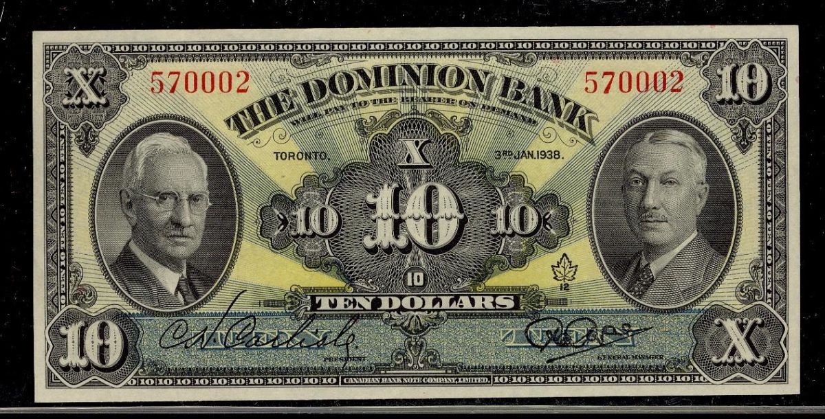 The Dominion Bank 1938 $10 #570002 CH-220-28-04. Bright EF-AU issue.