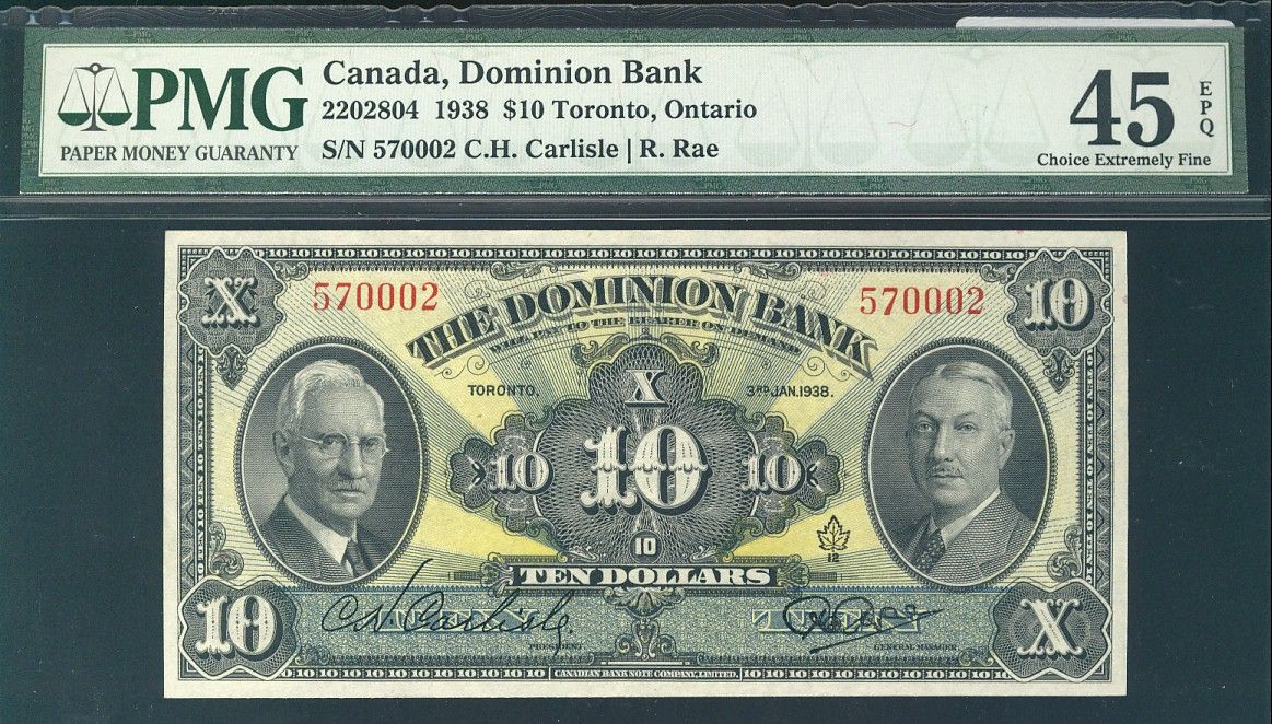 The Dominion Bank 1938 $10 #570002 CH-220-28-04 PMG EF45EPQ. Sharp colourful example.