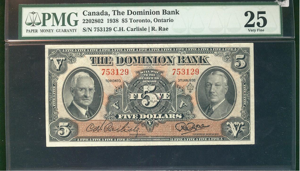 The Dominion Bank, 1938 $5 #753129, CH-220-28-02, PMG VF25.