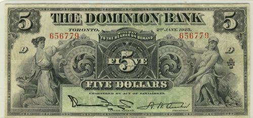 The Dominion Bank 220-16-14 1925 $5 about EF. Seldom seen so nice. Clean and bright example.