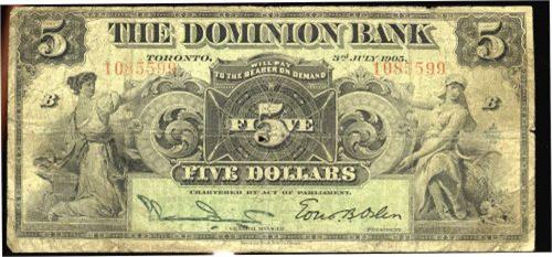 The Dominion Bank $5 1905 1085599. A better issue! CH-220-16-08. VG/VG+