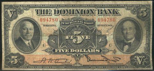 The Dominion Bank $5 1931 094780 CH-220-24-02 about Fine.