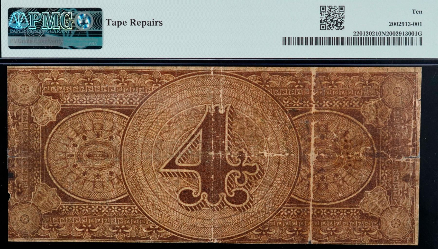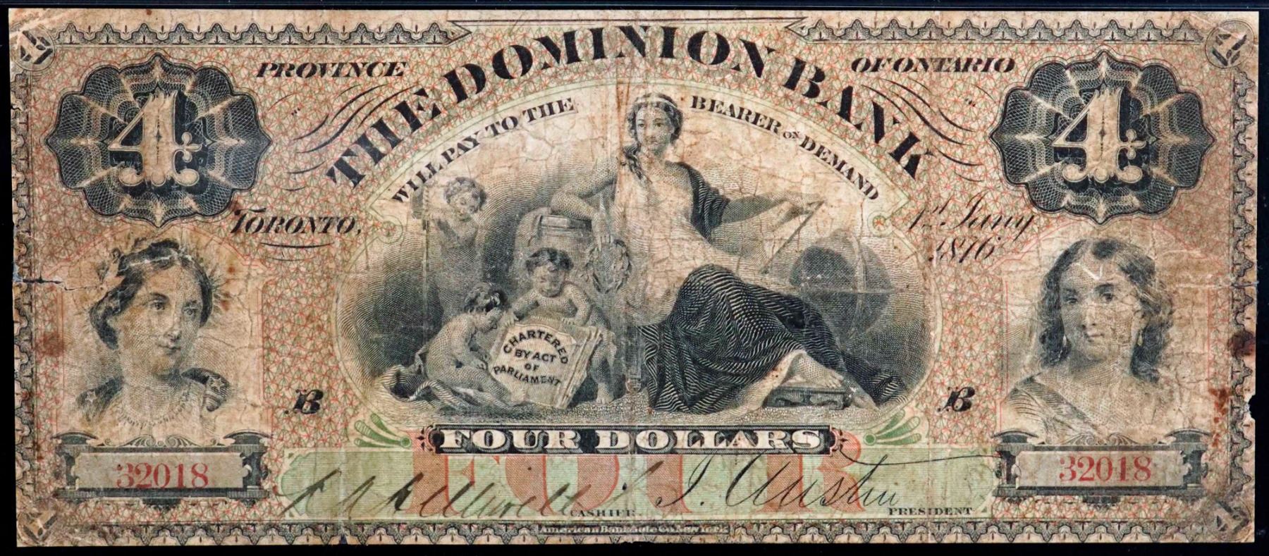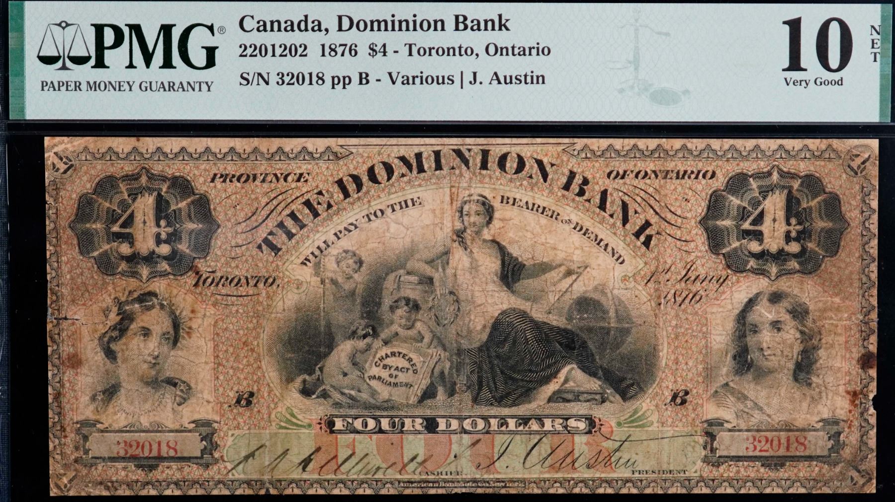 The Dominion Bank of Canada 1876 $4 #32018 CH-220-12-02, PMG Very Good-10. Tape repairs. A scarce and early type example.