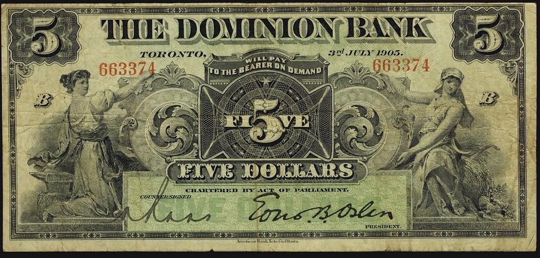 The Dominion Bank of Canada 1905 $5 #663374. A nice VF+ issue.