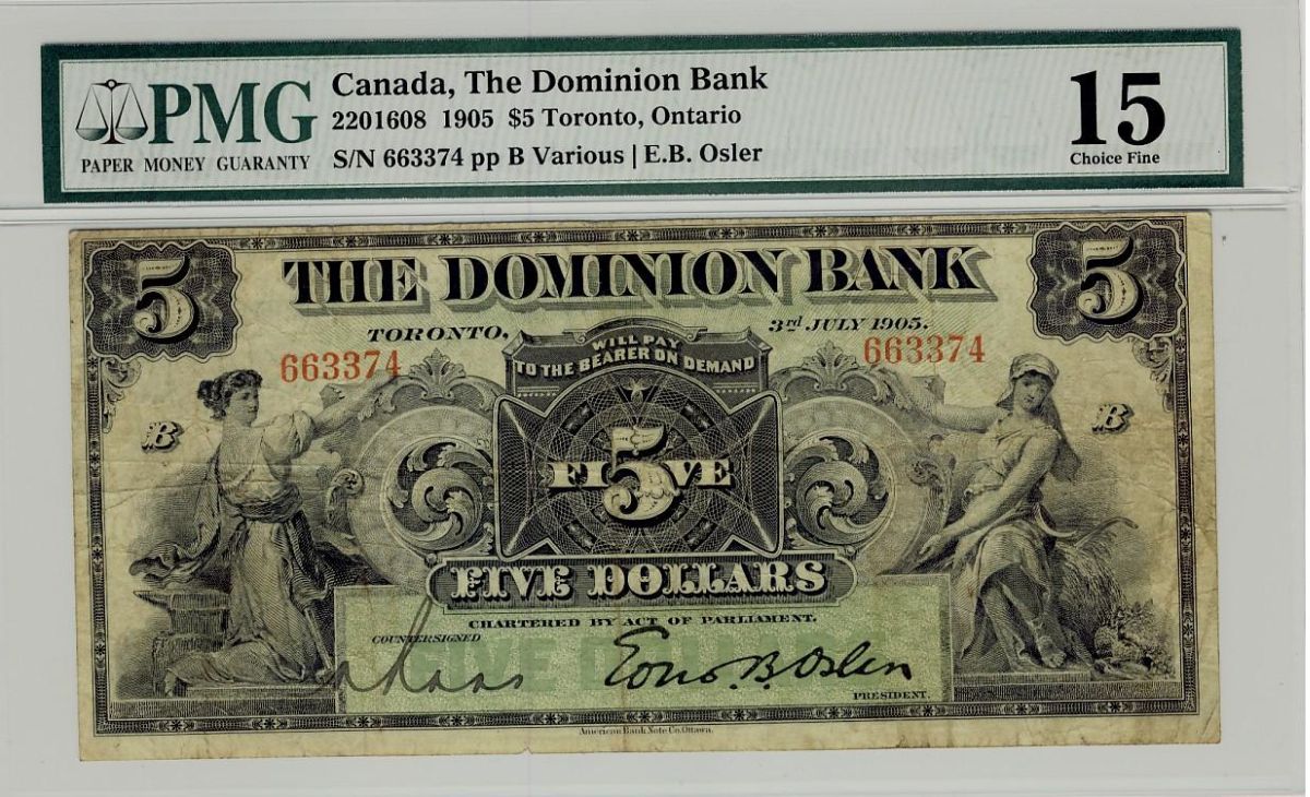 The Dominion Bank of Canada 1905 $5 #663374, CH-220-16-10. A nice PMG F15 issue.