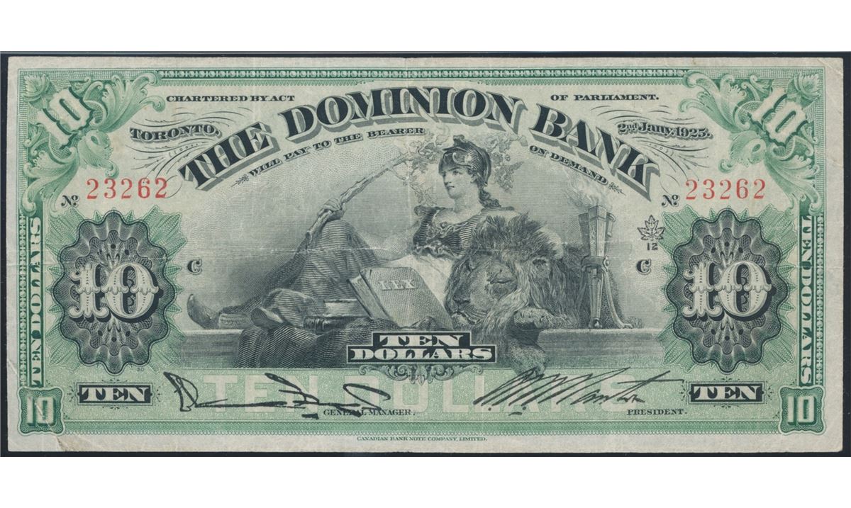 The Dominion Bank of Canada 1925 $10 #23262, CH-220-18-08, PMG VF25. Rare Nanton signature.
