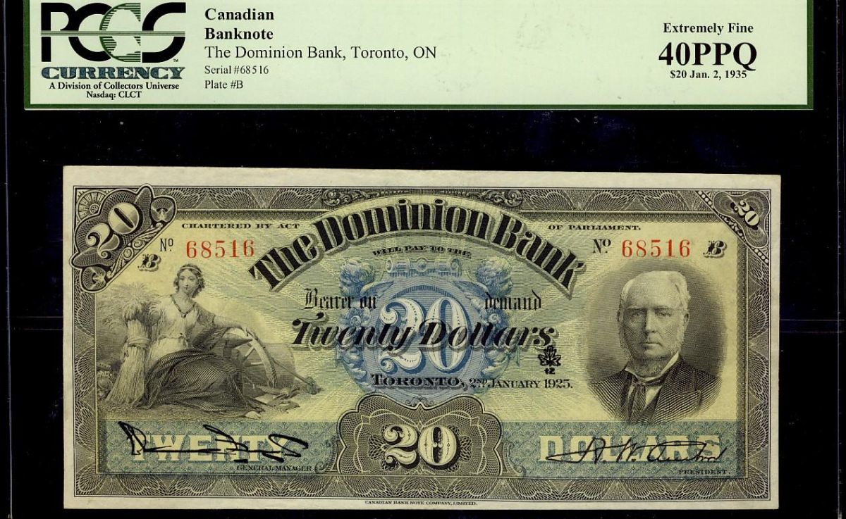 The Dominion Bank of Canada 1925 $20 #68516 CH-220-20-08 PCGS EF40PPQ. Bright with great eye appeal.