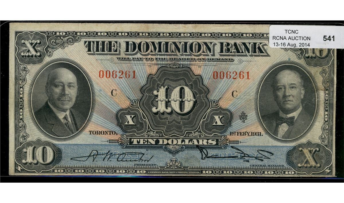 The Dominion Bank of Canada; 1931 $10 #006261, CH-220-24-08. Abt VF for grade.