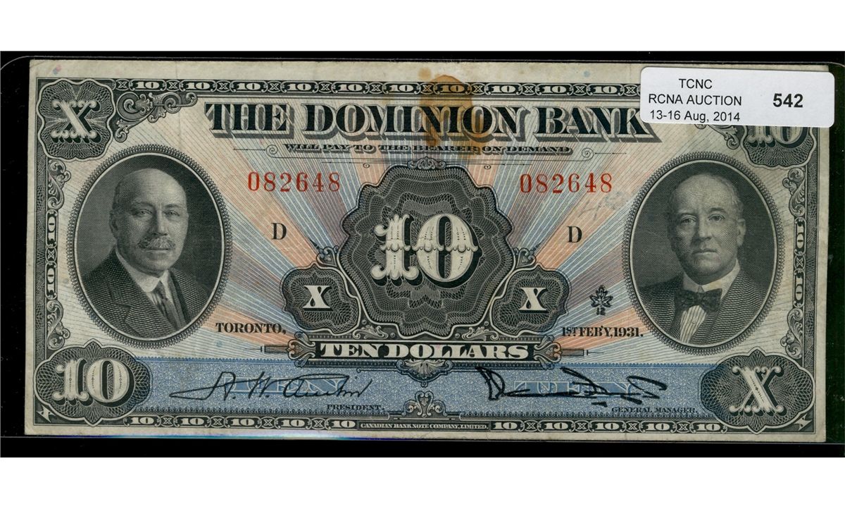 The Dominion Bank of Canada; 1931 $10 #082648, CH-220-24-08. VF for grade, with small stain and small number writing.