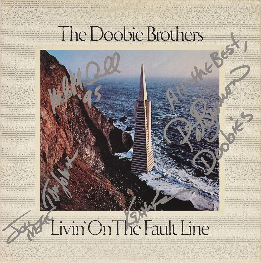 Livin' On The Fault Line album signed on the front cover in silver ink, "Michael McDonald, '95," "All the best, Pat Simmons, Doobies," "Tom Johnson," "Keith Knudsen," and "John McFee". In fine condition. The record is included.