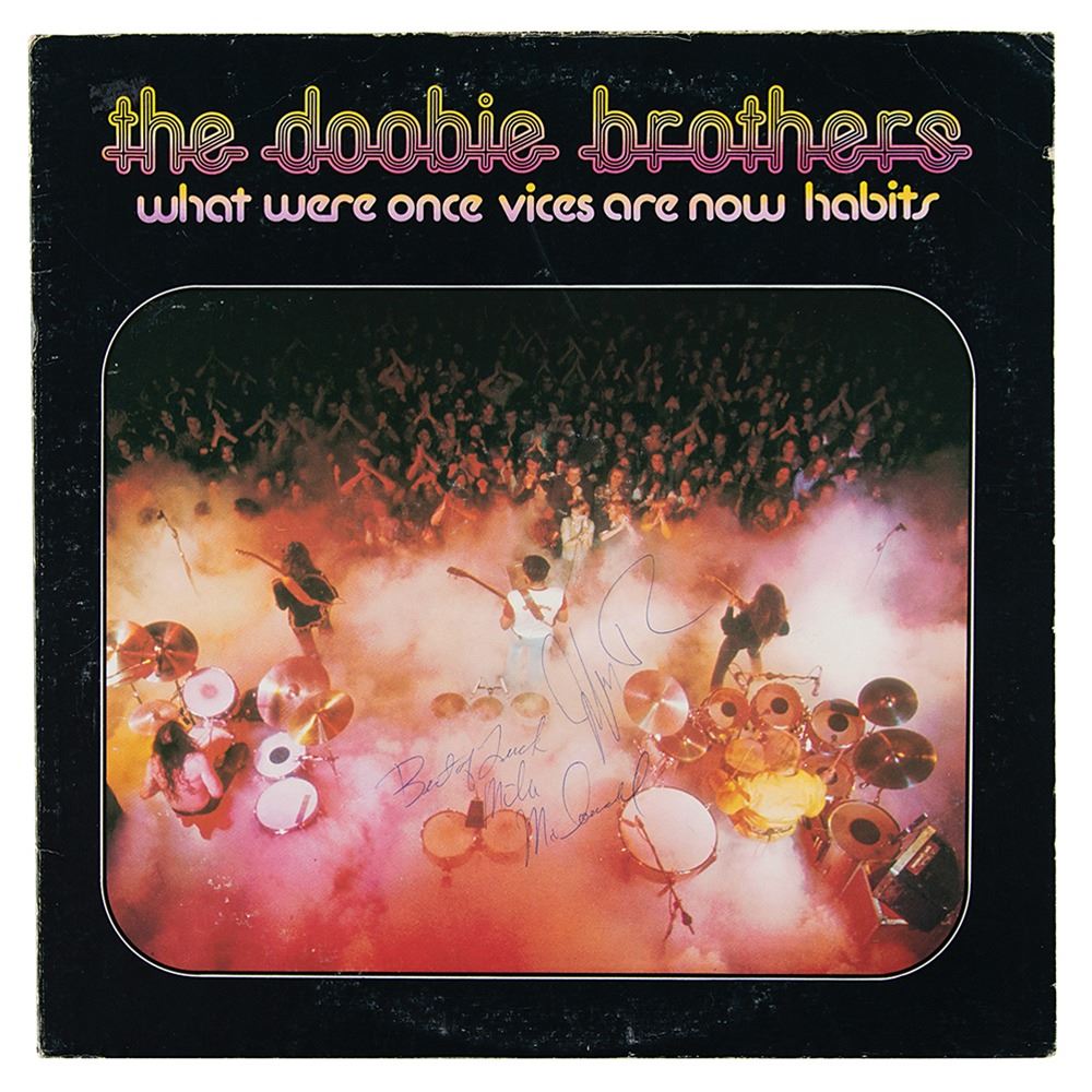 What Were Once Vices Are Now Habits album signed on the front cover in blue ballpoint by Michael McDonald and Jeff Baxter. In very good to fine condition, with light scuffing, and partial edge separation. Accompanied by a 1978 transmittal letter from Connecticut radio station WPLR, awarding the signed album as a contest prize.