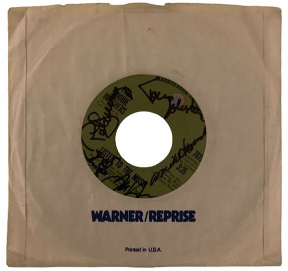 The Doobie Brothers ?signed 45 RPM– Listen To The Music 1972 signed 7 inch Vinyl autographed by Tom Johnston, Michael Hossack, Patrick Simmons, Tiran Porter and John Hartman – Warner Bros. Records – WB 7619. DB4