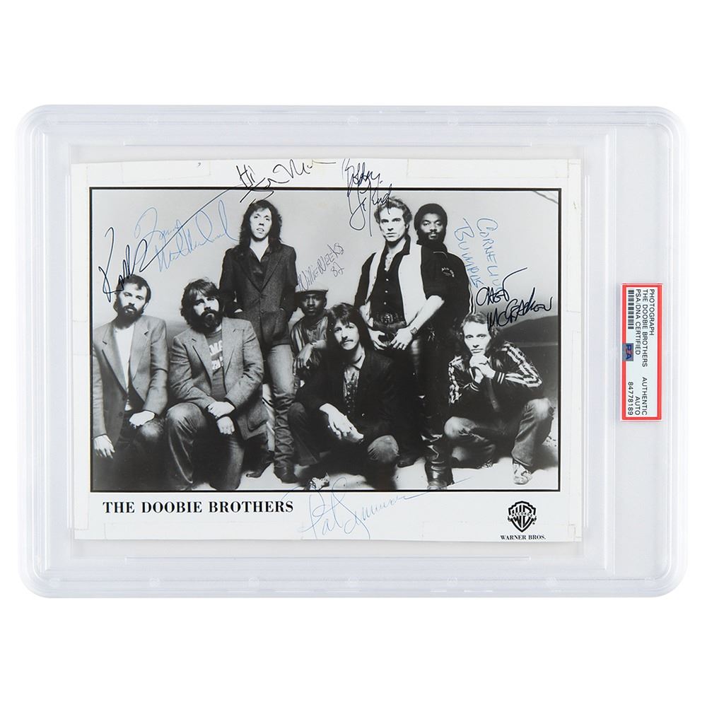 Glossy 10 x 7.5 Warner Bros. publicity photo of The Doobie Brothers from 1982, signed in various inks by Michael McDonald, Willie Weeks, Pat Simmons, John McFee, Keith Knudsen, Cornelius Bumpus, Chet McCracken, and Bobby LaKind. In very good to fine condition, with eight pieces of clear tape to the borders (none affecting any of the signatures) and trimmed top and bottom edges. Encapsulated in a PSA/DNA authentication holder.