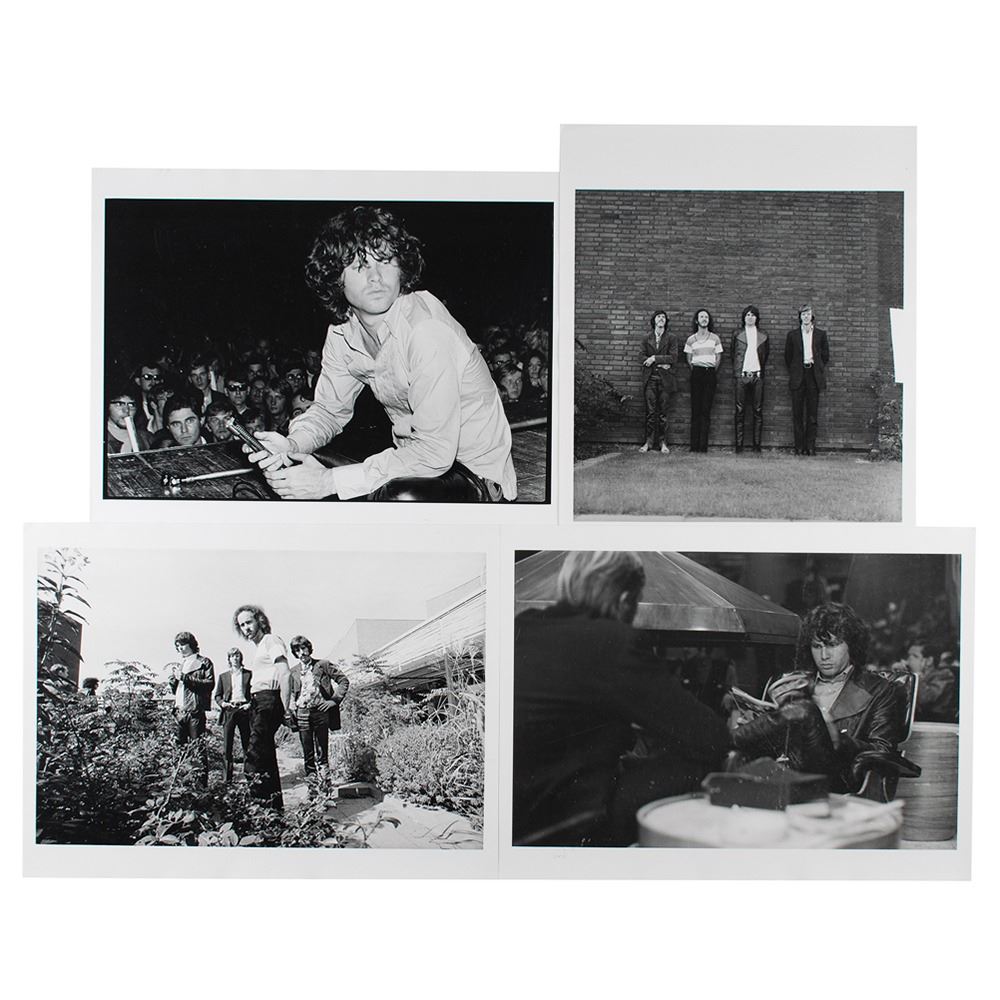 Four original glossy 16 x 12 silver gelatin photographs showing The Doors while on tour in Germany in 1968, printed from the original negatives. Includes two group photos—one of them against a brick wall and one candid shot of them outdoors—and two of Jim Morrison alone. In fine condition. Accompanied by a certificate of authenticity from Tracks.