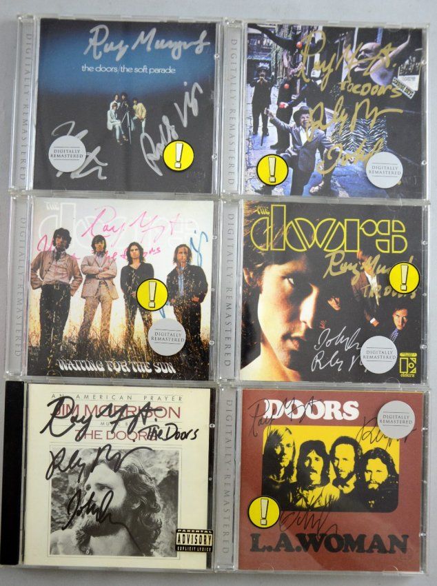 The Doors, 6 signed cds by the band members Ray Manzarek, Robby Krieger & John Densmor, all in different pen, cds present (6)