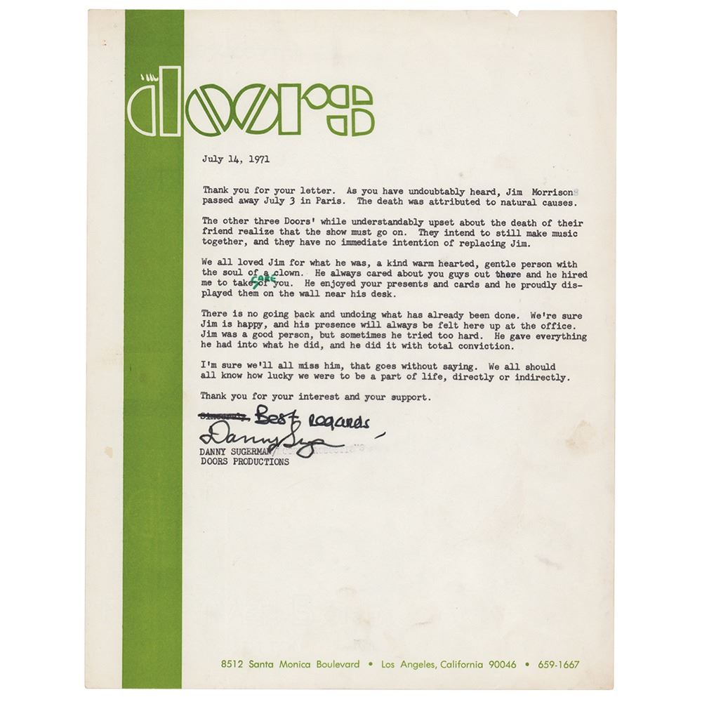 Incredible TLS signed “Best regards, Danny Sugerman,†one page, 8.5 x 11, The Doors letterhead, July 14, 1971. Written by Sugerman at the age of 16, a typed draft of a form letter issued to fans in the wake of lead singer Jim Morrison's recent death, in full: "Thank you for your letter. As you have undoubtedly heard, Jim Morrison passed away July 3 in Paris. The death was attributed to natural causes. The other three Doors' while understandably upset about the death of their friend realize that the show must go on. They intend to still make music together, and they have no immediate intention of replacing Jim. We all loved Jim for what he was, a kind warm hearted, gentle person with the soul of a clown. He always cared about you guys out there and he hired me to take care of you. He enjoyed your presents and cards and he proudly displayed them on the wall near his desk. There is no going back and undoing what has already been done. We're sure Jim is happy, and his presence will always be felt here up at the office. Jim was a good person, but sometimes he tried too hard. He gave everything he had into what he did, and he did it with total conviction. I'm sure we'll all miss him, that goes without saying. We all should all know how lucky we were to be a part of life, directly or indirectly. Thank you for your interest and support." In very good to fine condition, with light creasing, and a small chip to the top edge. Accompanied by a letter of authenticity from Sugerman’s widow, Fawn Hall.