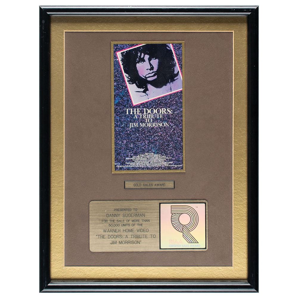 Official ‘R’ hologram-style RIAA gold sales award presented "to Danny Sugerman, for the sale of more than 50,000 units of the Warner Home Video, ‘The Doors: A Tribute to Jim Morrison.’†Framed with its plate and a cover image of the VHS to an overall size of 13 x 17. In fine condition.