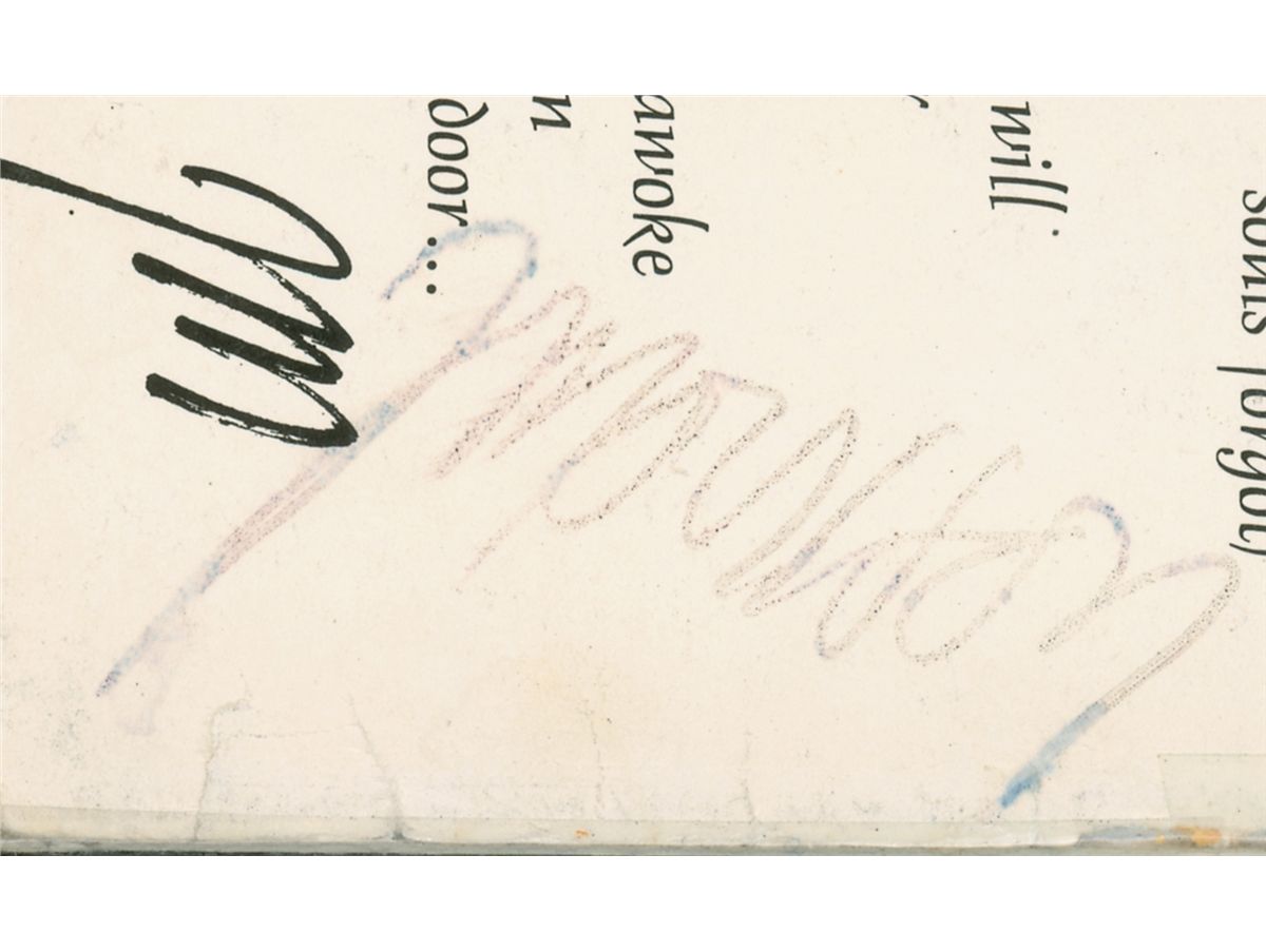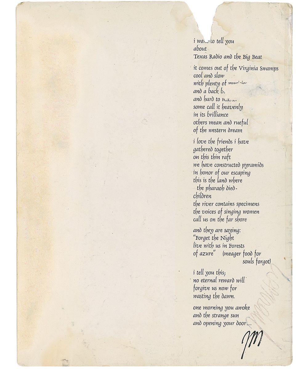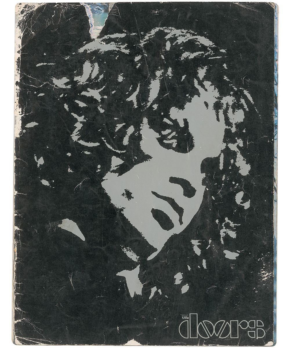 Doors 1968 Waiting for the Sun tour program, 8.75 x 11.5, 20 pages. Signed on the inside front cover in black felt tip, “J. Morrison,” next to some printed lyrics, including a portion of ‘Texas Radio.’ In good condition, with front cover reattached to spine with tape, moderate creasing to covers and pages, paper loss to front cover and tops of several pages, several loose and detached pages, and Morrison’s signature fairly light, but legible due to irregular ink adhesion. Accompanied by a full letter of authenticity from Roger Epperson/REAL.